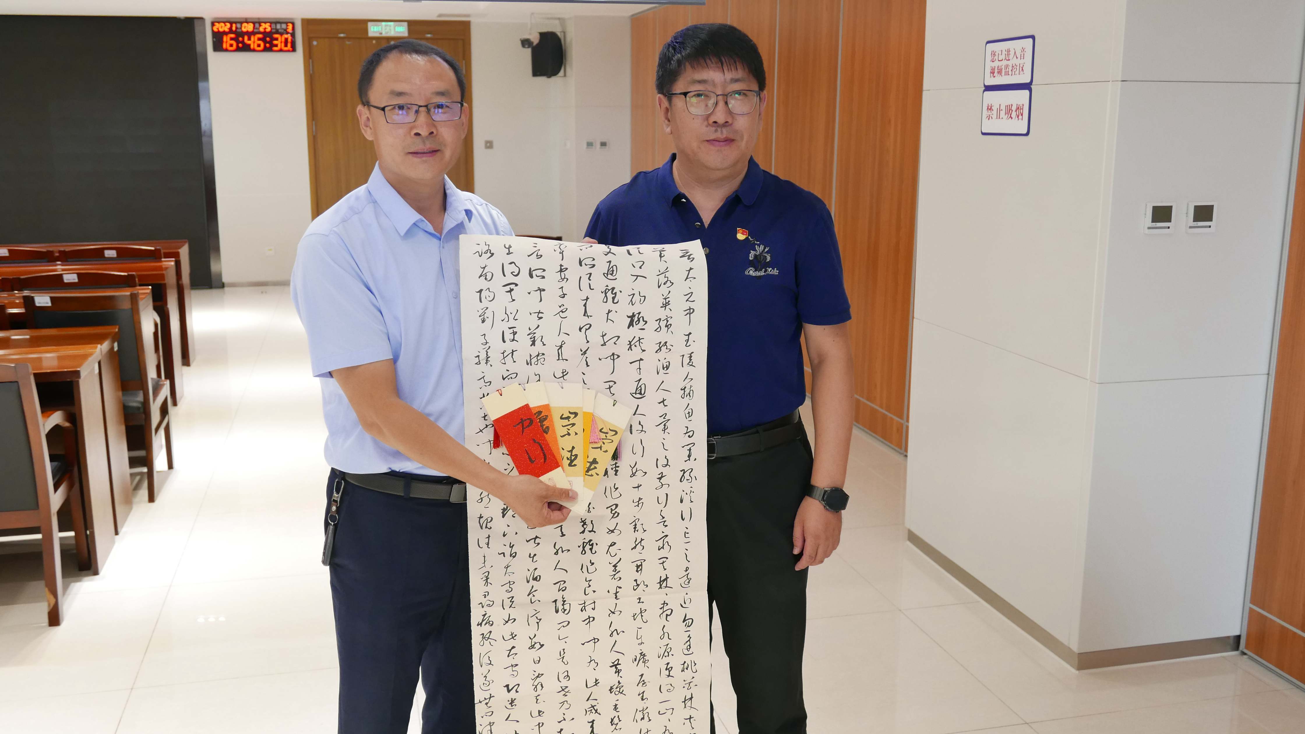 讀書分享后,和利黨支部向第二黨支部、第五黨支部贈送《鄧小平傳》、《長征》等20余本書籍。郝浚文同志代表公共資源交易中心向和利黨支部贈與十余幅個人書法作品。
